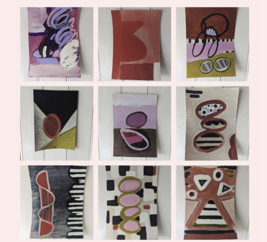 But… I have the ideas all there, a quite clear way forward, right? In my head, this is all looking just great. The problem is that I can't stop comparing the new versions to the original sketches. I was considering this problem before — I thought I might leave the original pieces on paper alone and have them stand as their own thing. But I love these ideas and I want to incorporate them into this collection. I am trying to just take general colours and shapes and not attempt to recreate anything too closely, because I just drive myself mad…. But this afternoon I felt like I was going mad no matter what I tried. Putting too much pressure on myself and every brush stroke (which is the antithesis of my plan for these pieces — they should be instinctual and playful), and subsequently hating almost everything I put down. The paint looked horrible, the balance between shapes was off UGHHH. When there’s the slightest expectation on something, it's like I go to pieces. I'm still not sure whether it's best to just try to pull myself together and carry on when the work is like this, or accept defeat and call it a day. Or at least step away for a few hours.